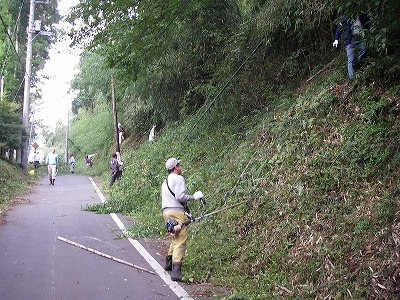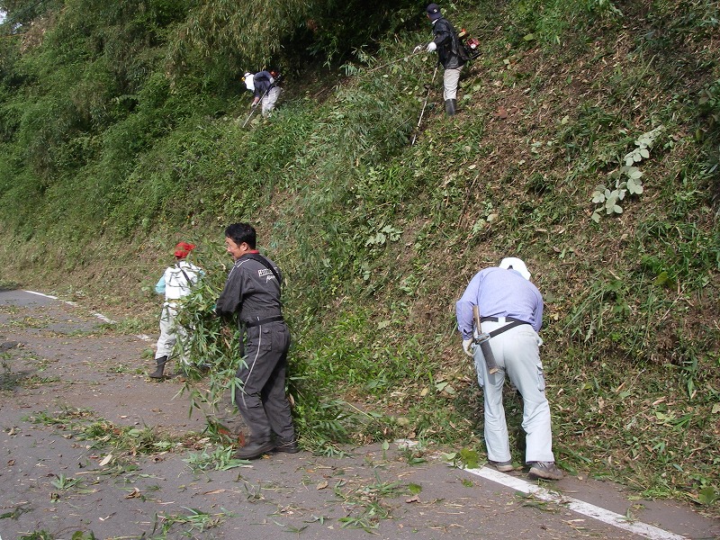 三沢から入った坂道はいつも美化運動最大の難所です。土手に生い茂った雑草や雑木を丁寧に刈っていきます。