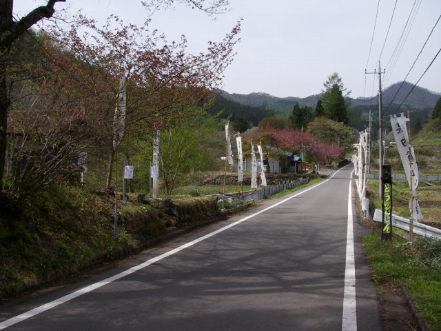 八重桜が咲いて周囲の山々が萌えて春爛漫の元三沢の様子です。